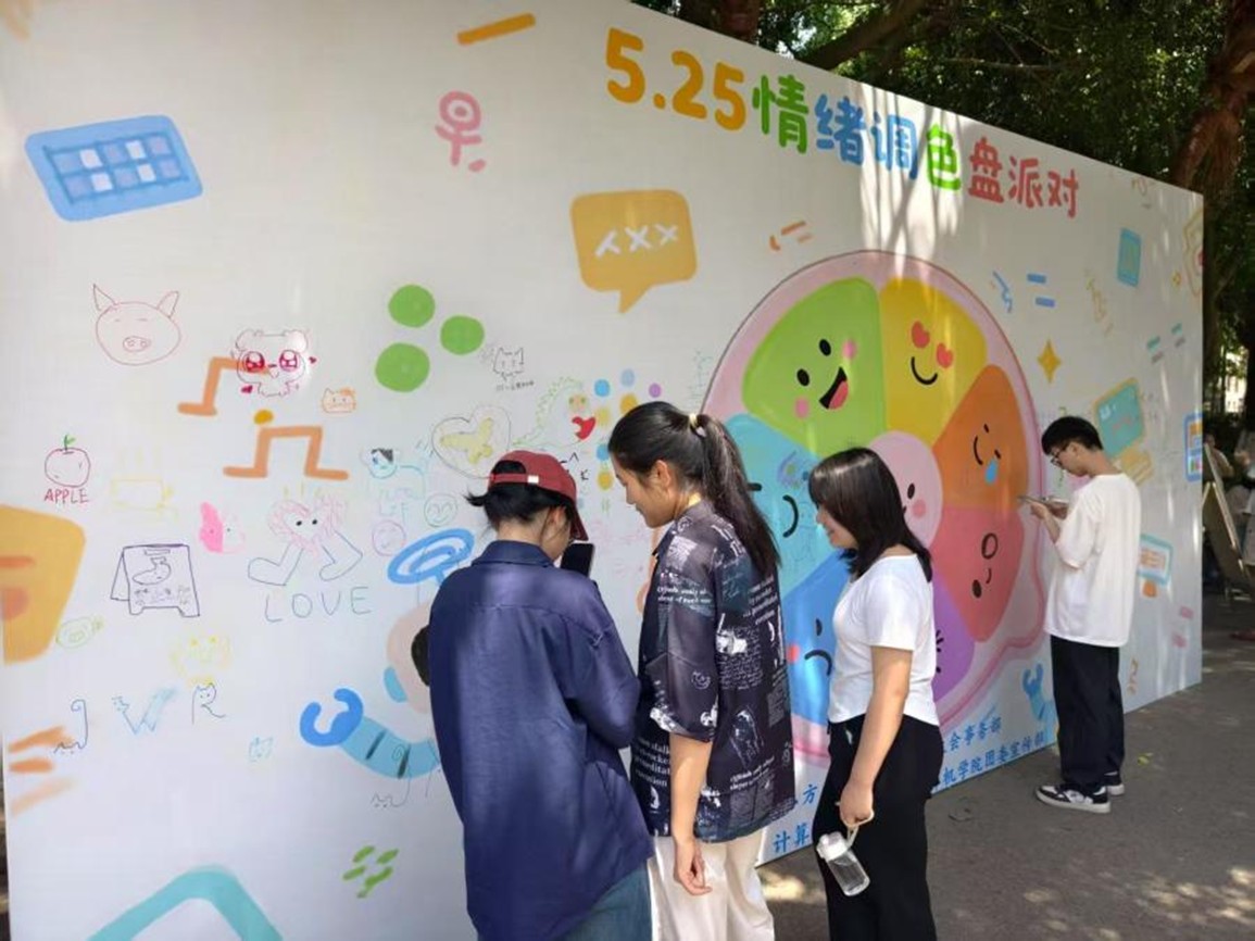 本网讯 丁家茹 张子凡 刘佳权 魏明阳 摄影报道:为积极响应国家关于大学生心理健康教育的工作部署,着力营造健康和谐的校园心理氛围,国产成人在线视频于2025年5月25日在本部西区凌云大道举办5.25"情绪调色盘派对"。此次活动以"我爱我"心理关爱日为契机,通过沉浸式互动体验引导同学们关注自我情绪,在色彩艺术与心理疗愈的融合中搭建心灵成长平台。